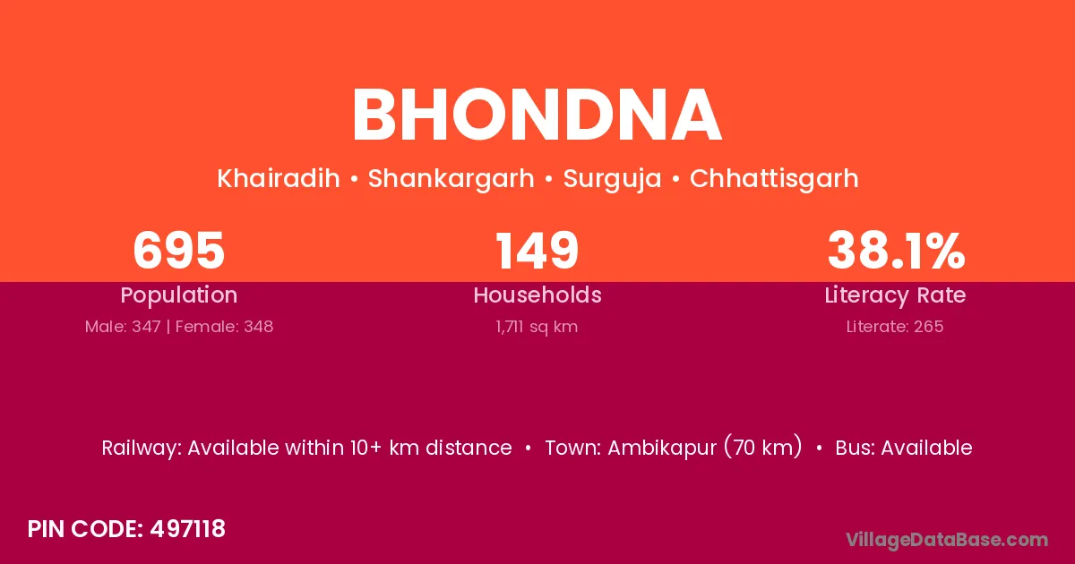 Ambikapur (70 km) is the nearest town to Bhondna village for major economic activities and is located approximately 70 km away.
