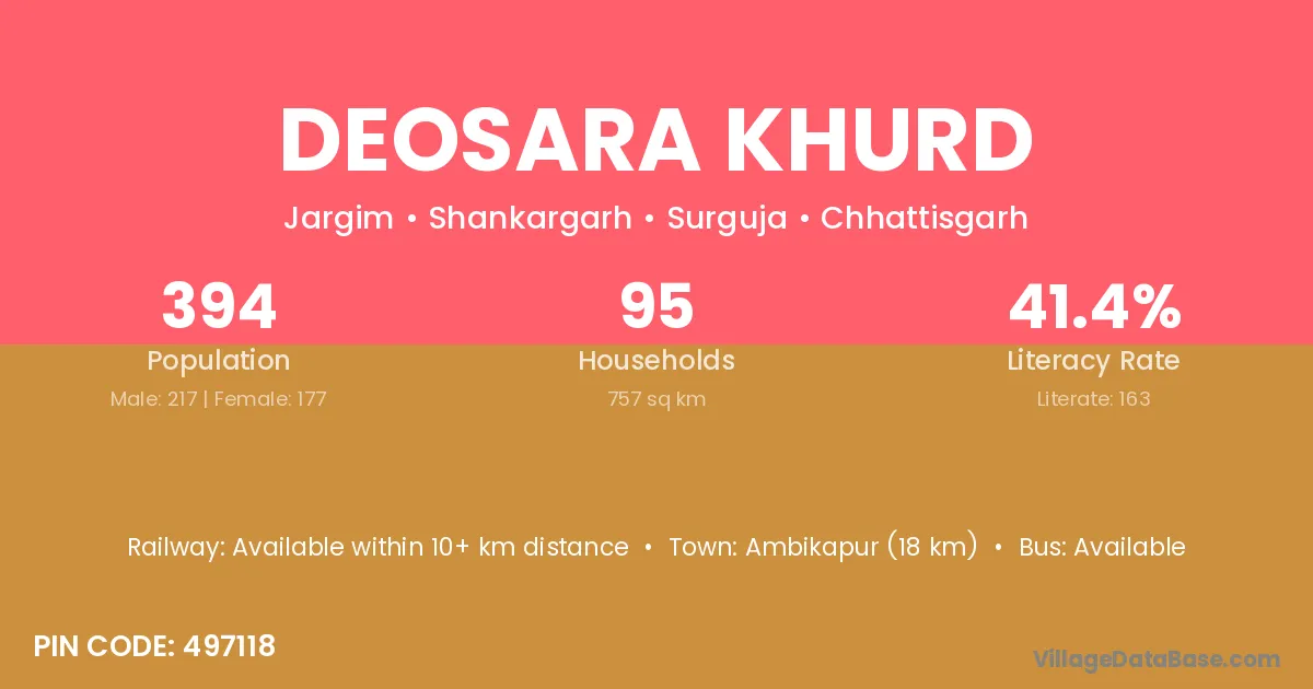 Ambikapur (18 km) is the nearest town to Deosara Khurd village for major economic activities and is located approximately 18 km away.