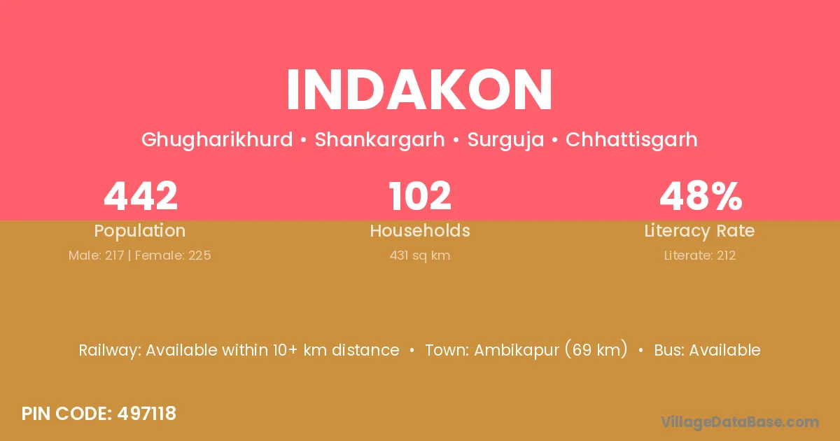 Ambikapur (69 km) is the nearest town to Indakon village for major economic activities and is located approximately 69 km away.