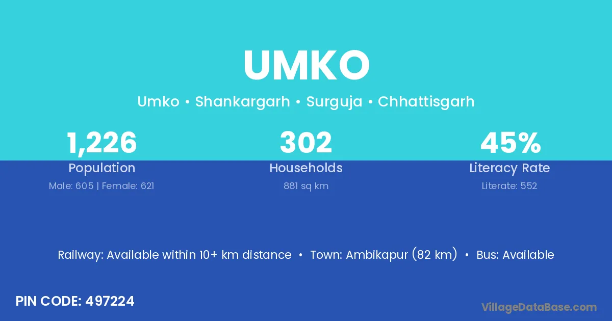 Ambikapur (82 km) is the nearest town to Umko village for major economic activities and is located approximately 82 km away.