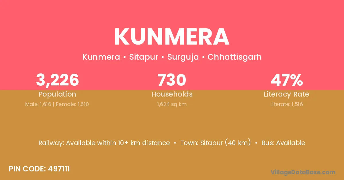 Kunmera village has a total population of 3,226 people, of which 1,616 are males and 1,610 are females.