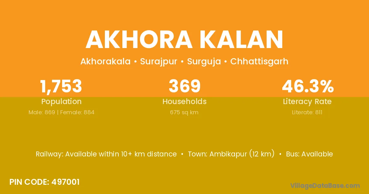 Ambikapur (12 km) is the nearest town to Akhora Kalan village for major economic activities and is located approximately 12 km away.