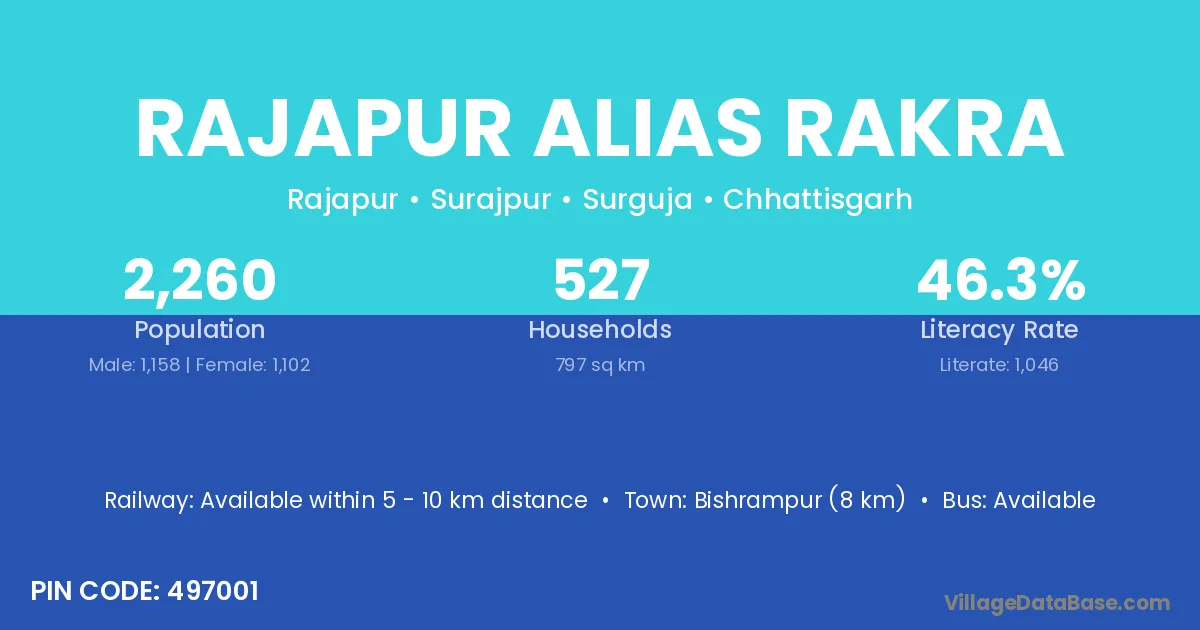 Bishrampur (8 km) is the nearest town to Rajapur Alias Rakra village for major economic activities and is located approximately 8 km away.