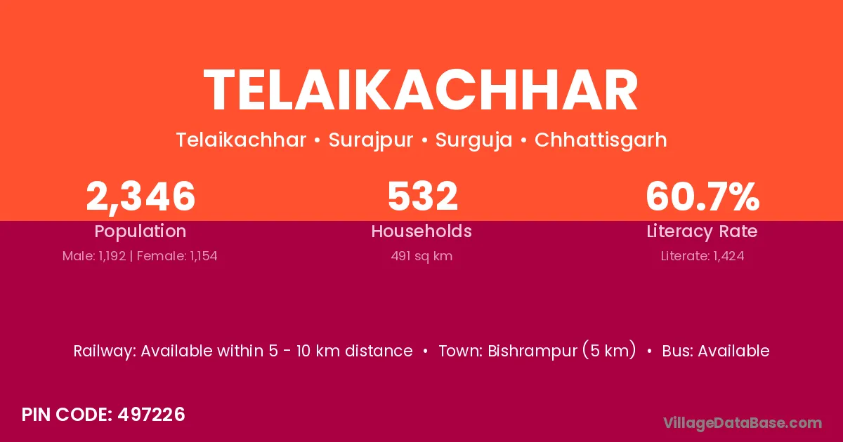 Bishrampur (5 km) is the nearest town to Telaikachhar village for major economic activities and is located approximately 5 km away.