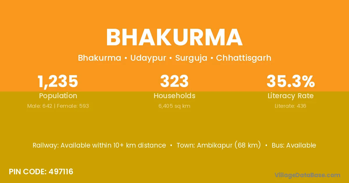 Ambikapur (68 km) is the nearest town to Bhakurma village for major economic activities and is located approximately 68 km away.