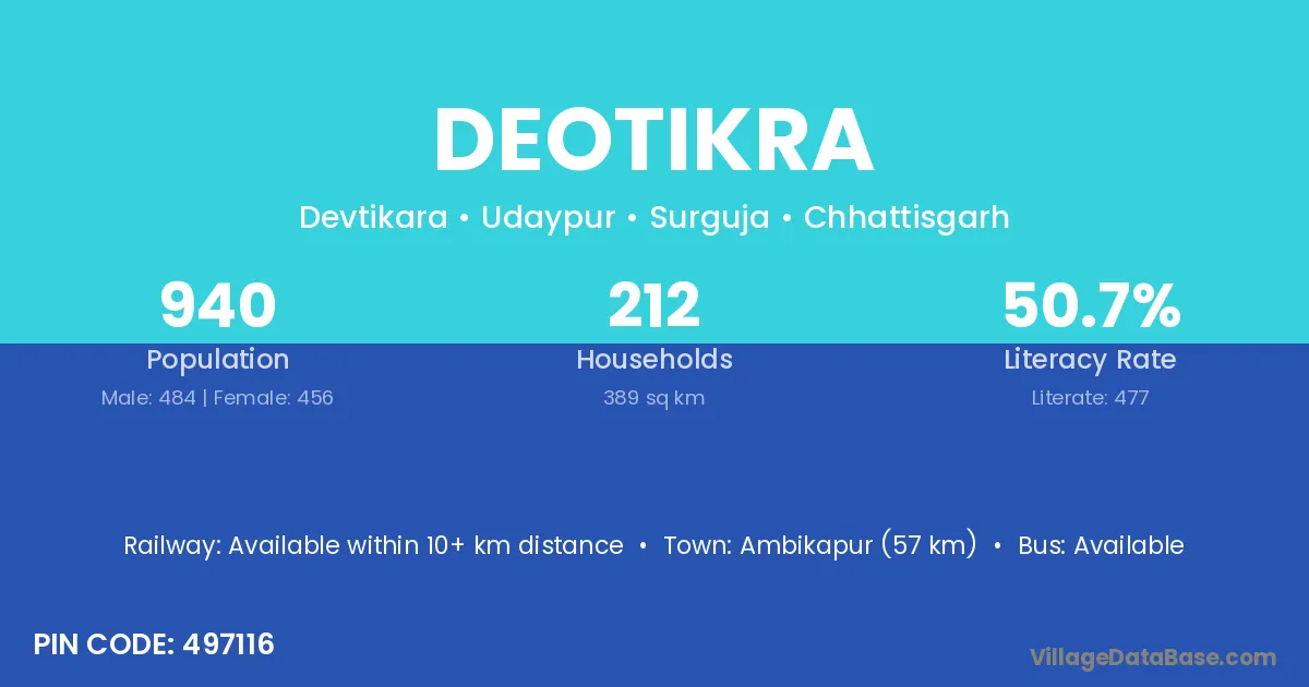 Ambikapur (57 km) is the nearest town to Deotikra village for major economic activities and is located approximately 57 km away.