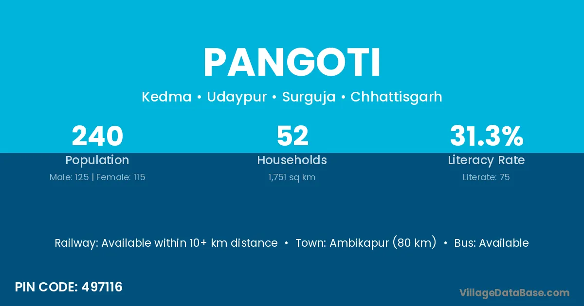 Ambikapur (80 km) is the nearest town to Pangoti village for major economic activities and is located approximately 80 km away.