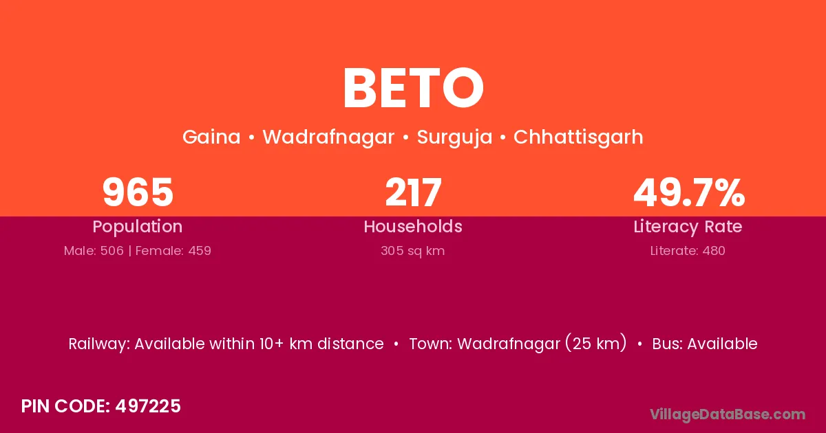 Beto village has a total population of 965 people, of which 506 are males and 459 are females.