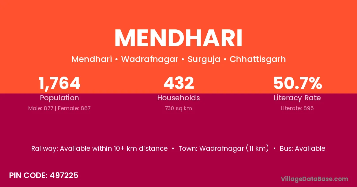 Wadrafnagar (11 km) is the nearest town to Mendhari village for major economic activities and is located approximately 11 km away.