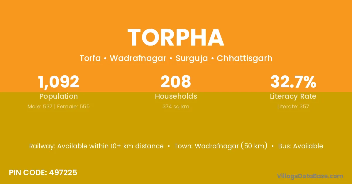 Wadrafnagar (50 km) is the nearest town to Torpha village for major economic activities and is located approximately 50 km away.