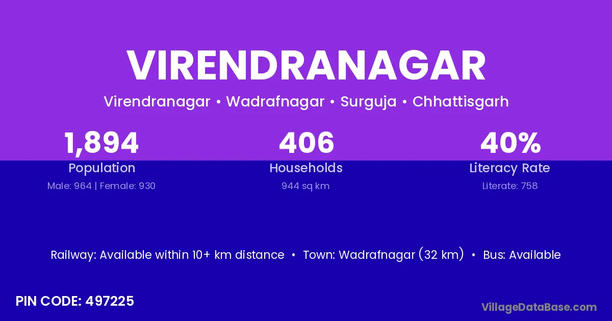 According to Census 2011 information, the village code of Virendranagar village is 497225.