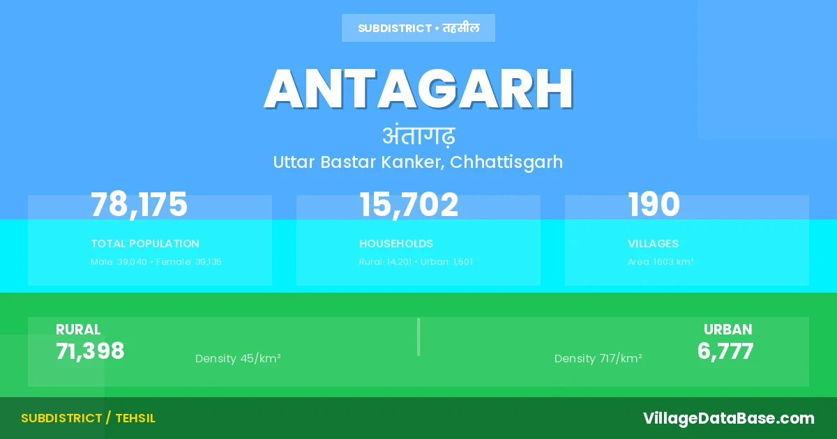 According to the 2011 census The total area of Antagarh Tehsil is 1603 km², with a population of 78175 people. The population density is 49 inhabitants per square kilometre, and there are approximately 15702 houses in the sub district.