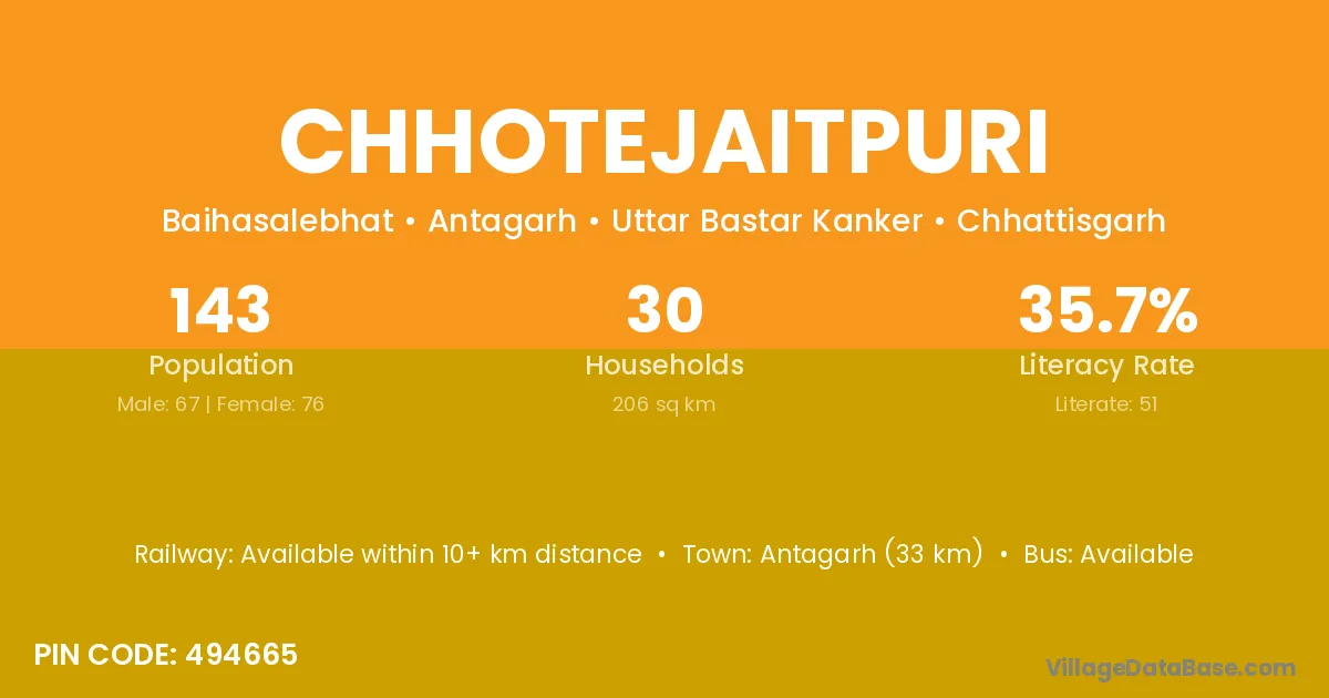 Chhotejaitpuri village has a total population of 143 people, of which 67 are males and 76 are females.