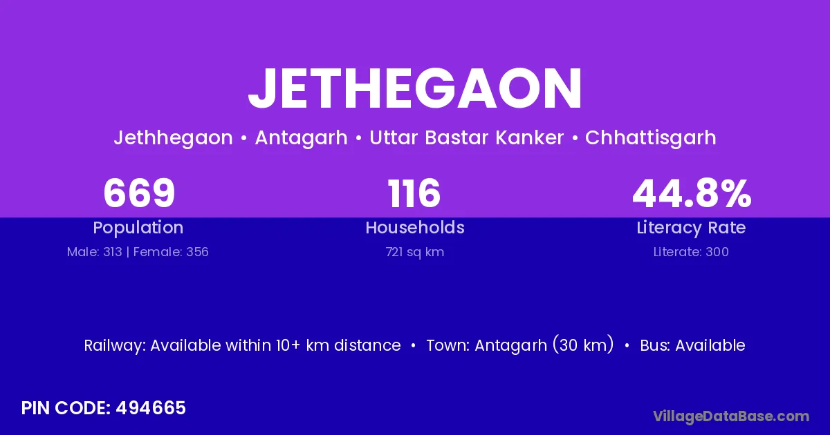 According to Census 2011 information, the village code of Jethegaon village is 494665.