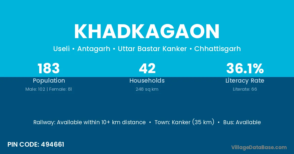 Kanker (35 km) is the nearest town to Khadkagaon village for major economic activities and is located approximately 35 km away.