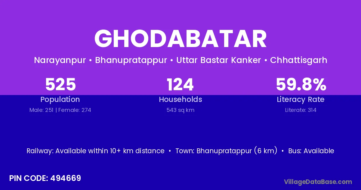 Bhanupratappur (6 km) is the nearest town to Ghodabatar village for major economic activities and is located approximately 6 km away.