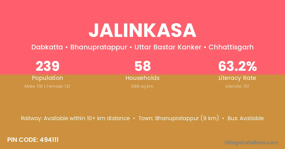 Jalinkasa village has a total population of 239 people, of which 118 are males and 121 are females.