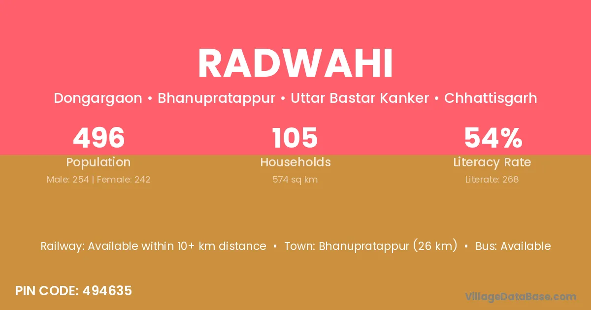 Bhanupratappur (26 km) is the nearest town to Radwahi village for major economic activities and is located approximately 26 km away.