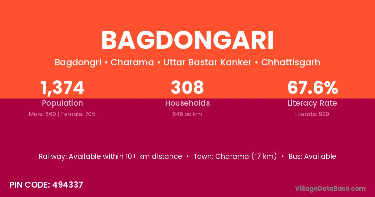 Charama (17 km) is the nearest town to Bagdongari village for major economic activities and is located approximately 17 km away.
