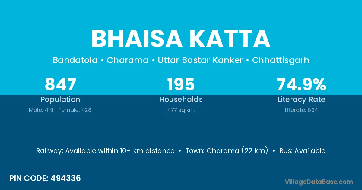 Bhaisa Katta village has a total population of 847 people, of which 419 are males and 428 are females.