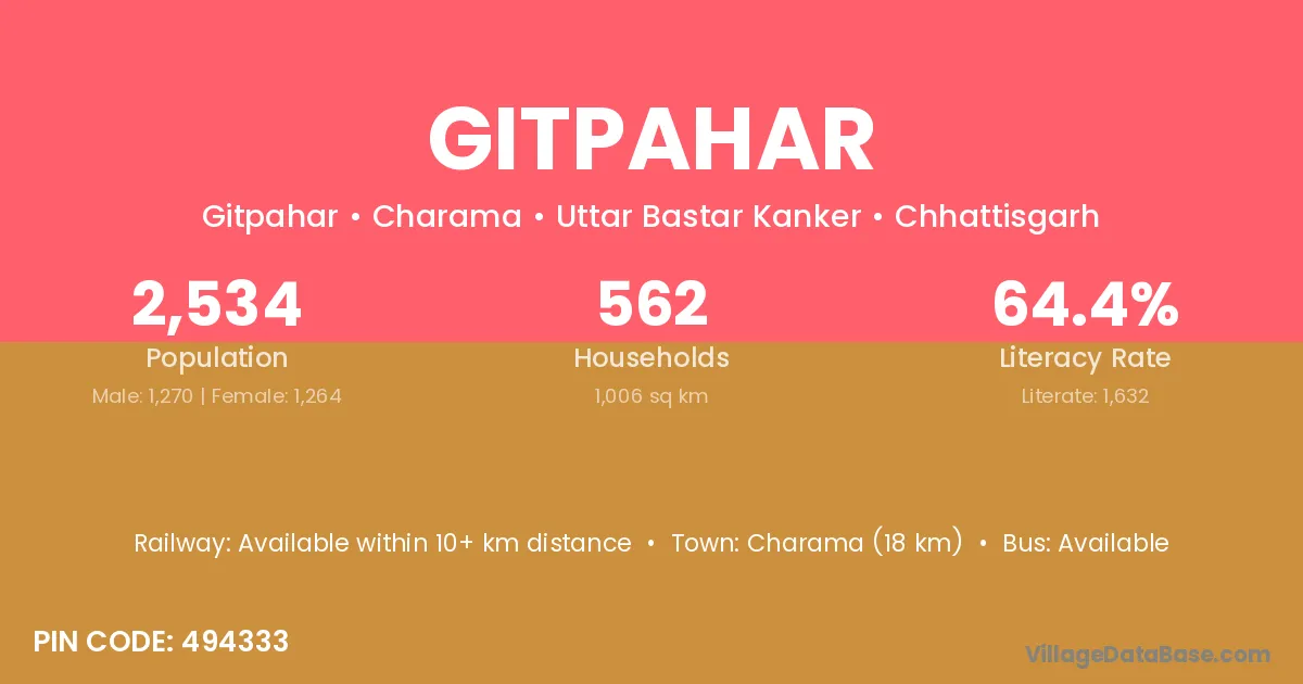 Gitpahar village has a total population of 2,534 people, of which 1,270 are males and 1,264 are females.
