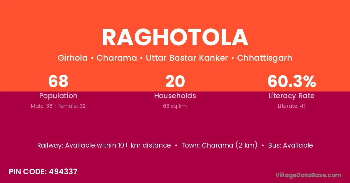 Charama (2 km) is the nearest town to Raghotola village for major economic activities and is located approximately 2 km away.