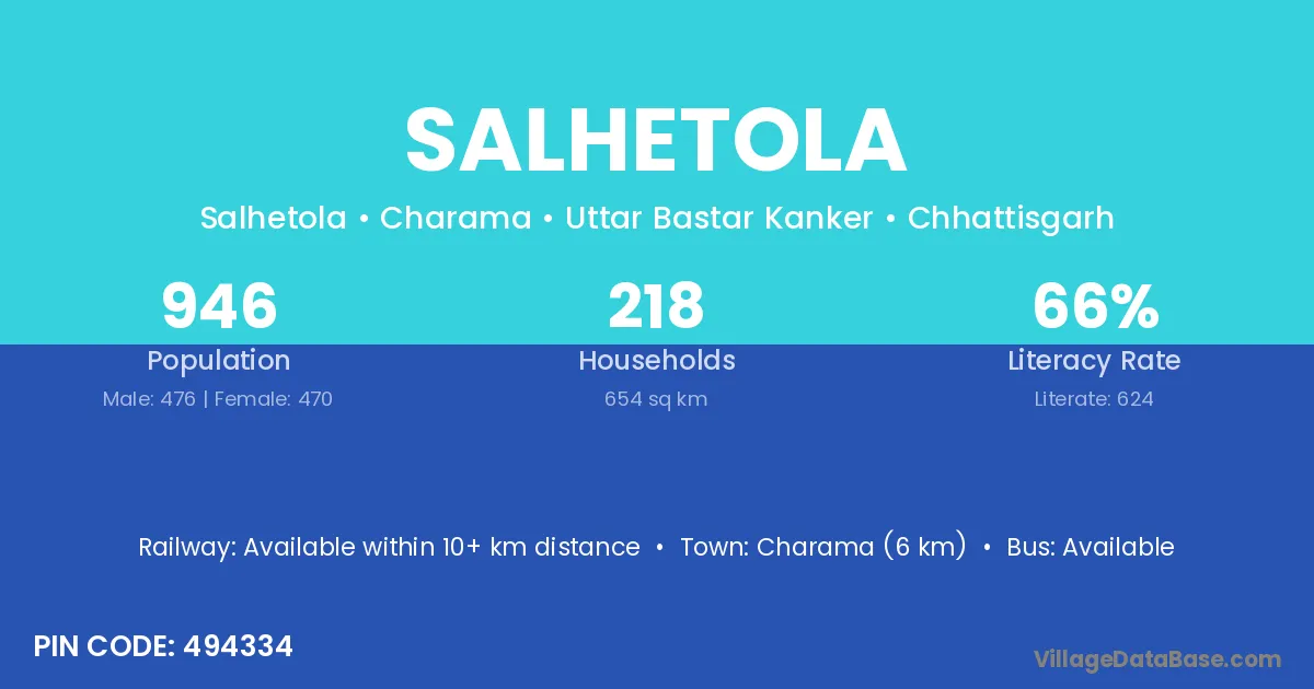 Charama (6 km) is the nearest town to Salhetola village for major economic activities and is located approximately 6 km away.