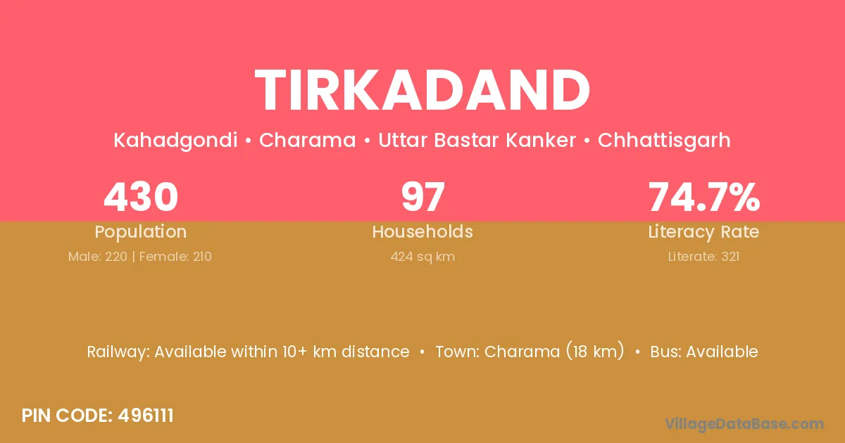 Tirkadand village has a total population of 430 people, of which 220 are males and 210 are females.