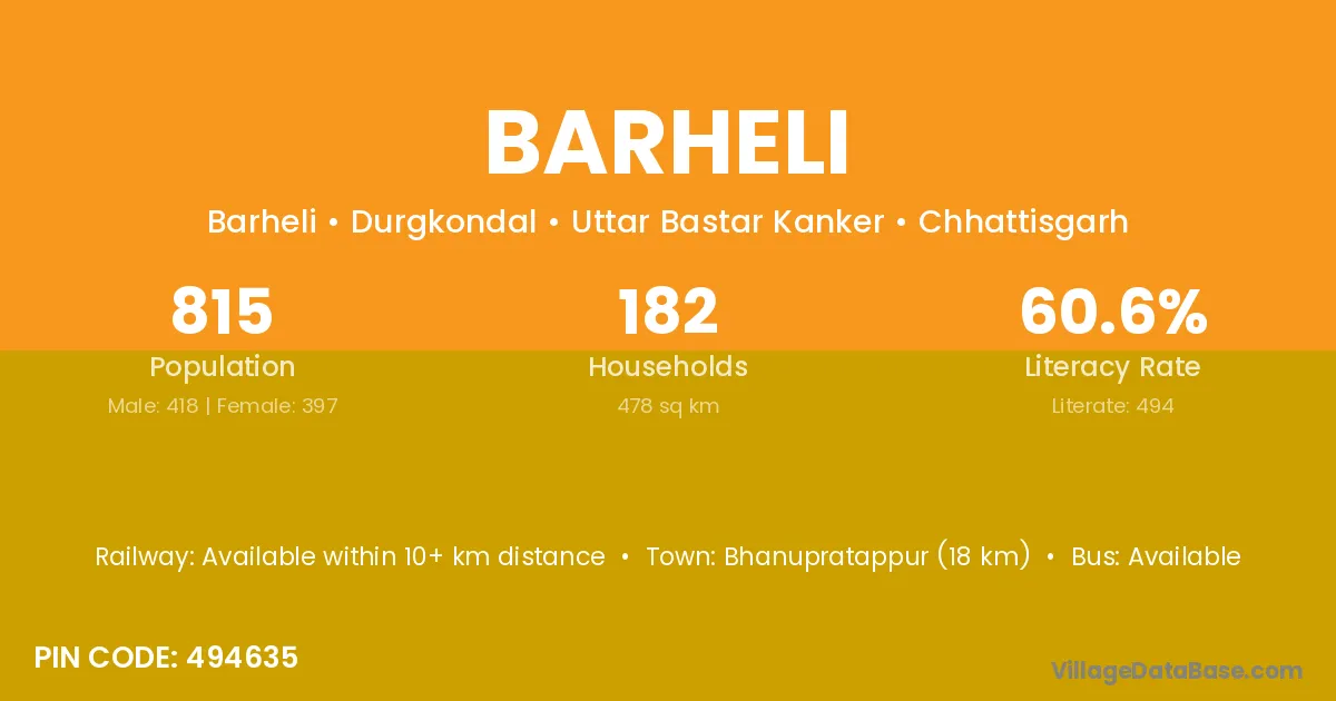 Bhanupratappur (18 km) is the nearest town to Barheli village for major economic activities and is located approximately 18 km away.