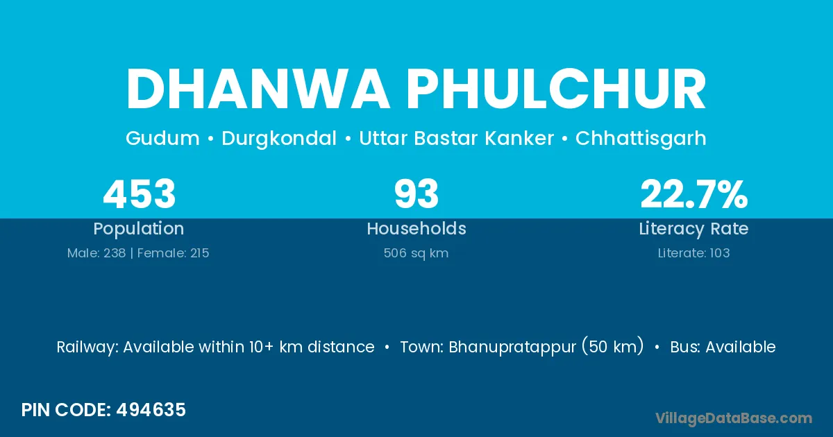Bhanupratappur (50 km) is the nearest town to Dhanwa Phulchur village for major economic activities and is located approximately 50 km away.