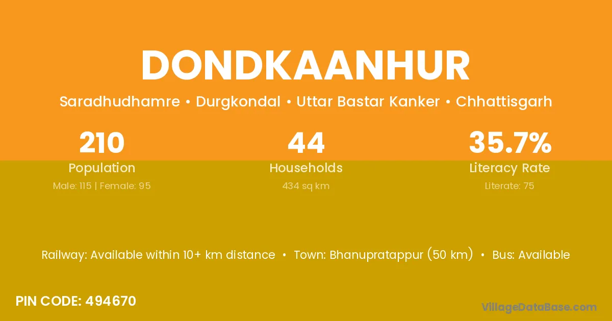Bhanupratappur (50 km) is the nearest town to Dondkaanhur village for major economic activities and is located approximately 50 km away.