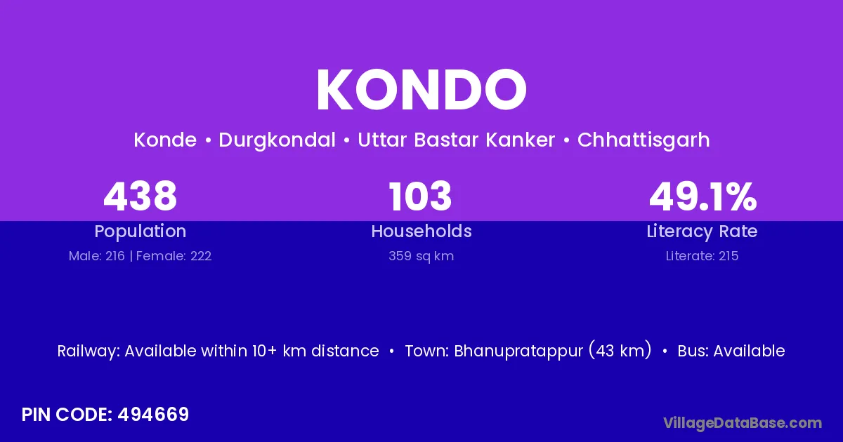 Bhanupratappur (43 km) is the nearest town to Kondo village for major economic activities and is located approximately 43 km away.