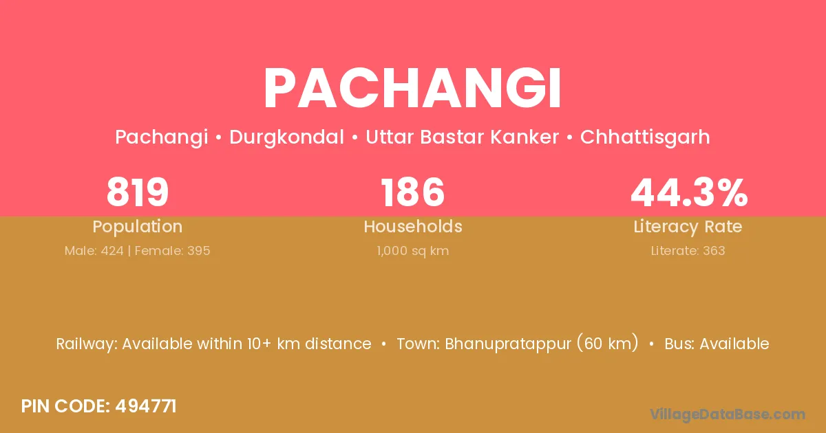 Bhanupratappur (60 km) is the nearest town to Pachangi village for major economic activities and is located approximately 60 km away.