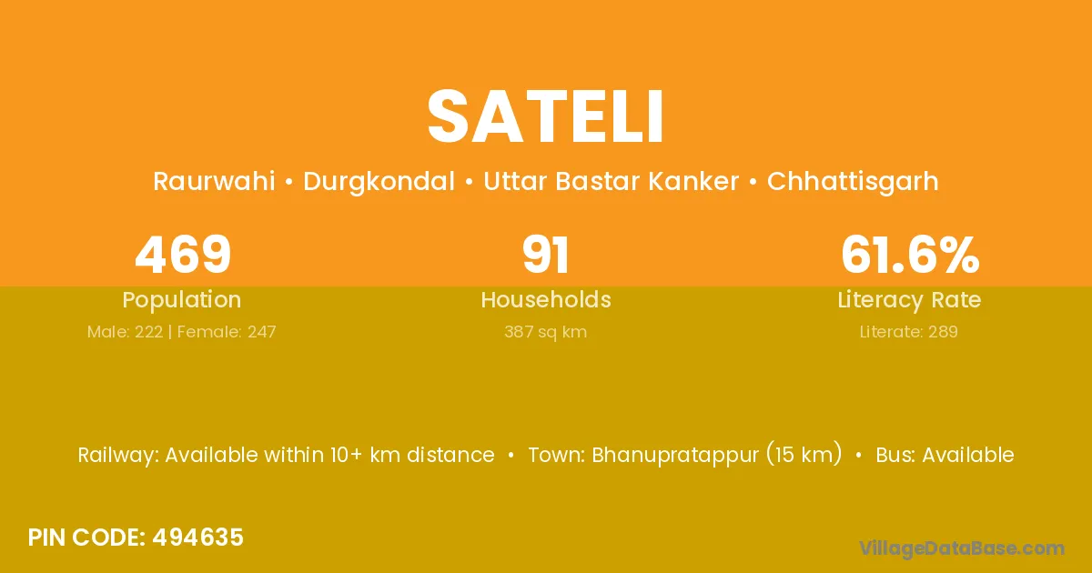 Bhanupratappur (15 km) is the nearest town to Sateli village for major economic activities and is located approximately 15 km away.
