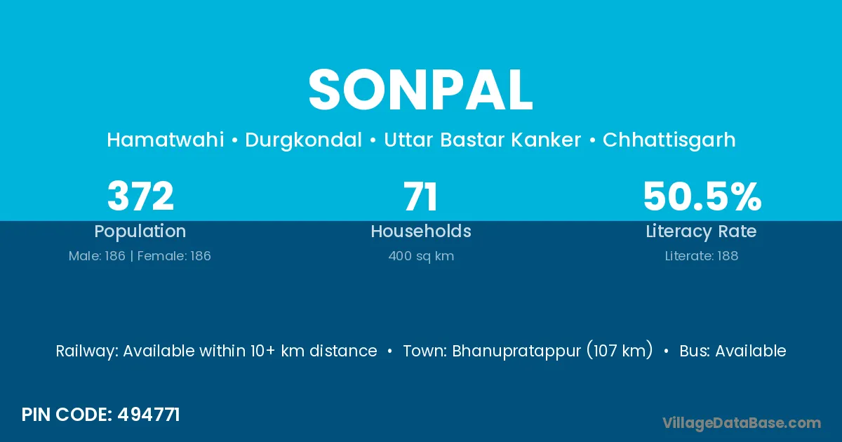 Bhanupratappur (107 km) is the nearest town to Sonpal village for major economic activities and is located approximately 107 km away.
