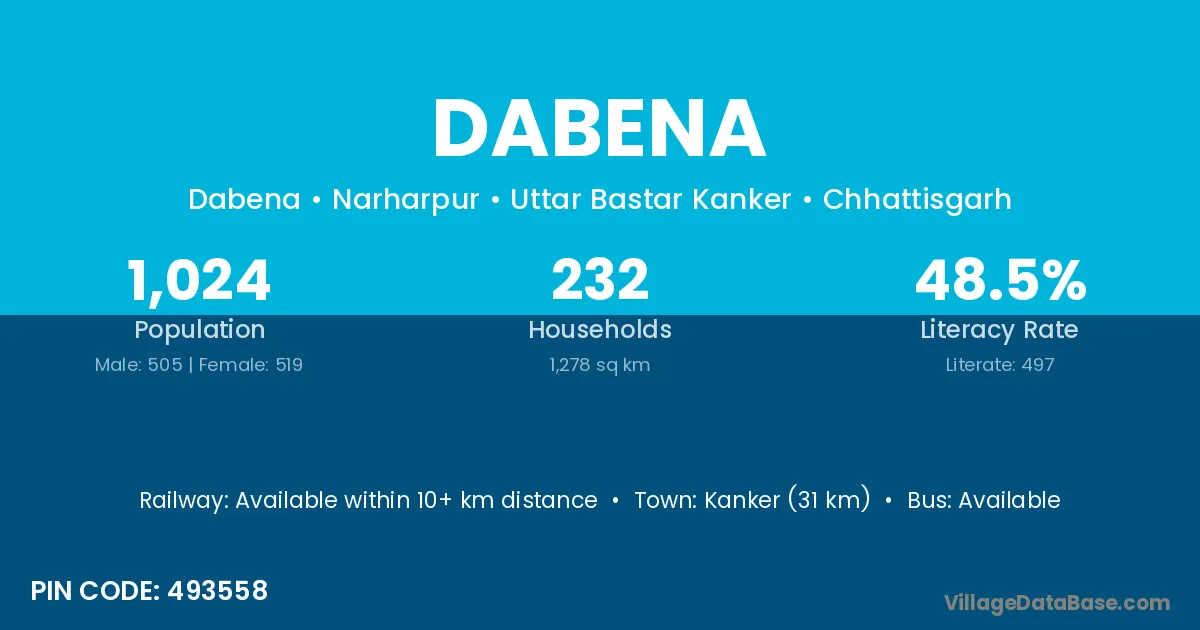 Kanker (27 km) is the nearest town to Dabena village for major economic activities and is located approximately 27 km away.