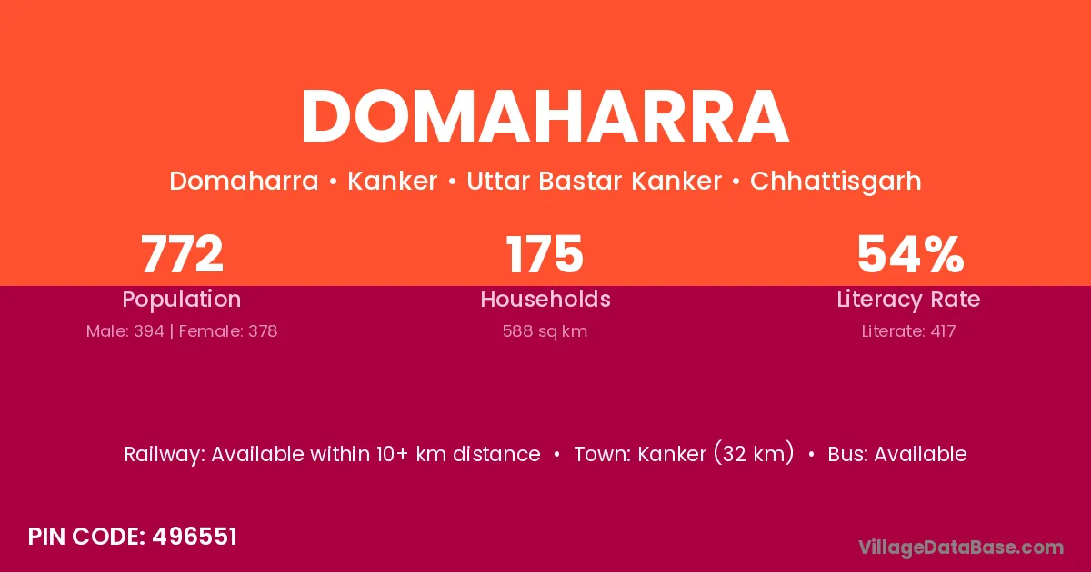 Kanker (32 km) is the nearest town to Domaharra village for major economic activities and is located approximately 32 km away.