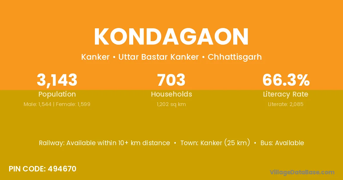 Kanker (25 km) is the nearest town to Kondagaon village for major economic activities and is located approximately 25 km away.
