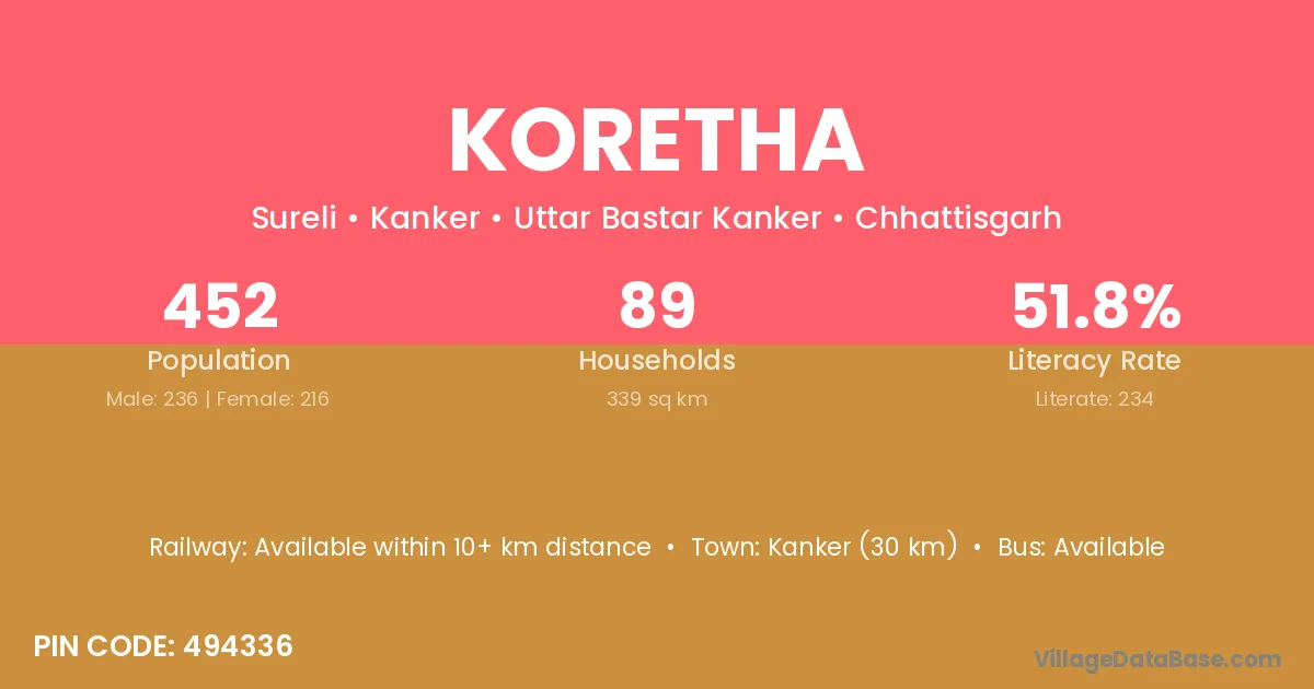 Kanker (30 km) is the nearest town to Koretha village for major economic activities and is located approximately 30 km away.