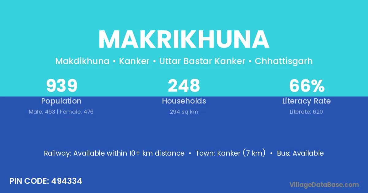 Kanker (7 km) is the nearest town to Makrikhuna village for major economic activities and is located approximately 7 km away.