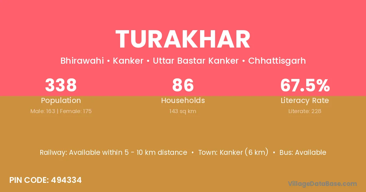Kanker (6 km) is the nearest town to Turakhar village for major economic activities and is located approximately 6 km away.