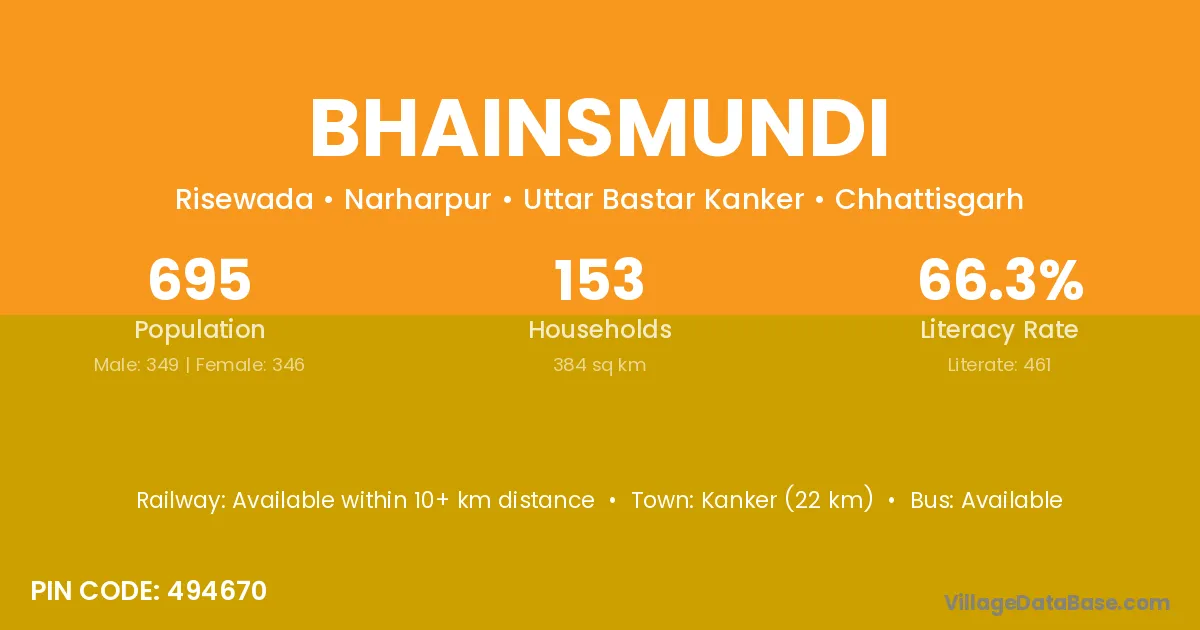 Kanker (22 km) is the nearest town to Bhainsmundi village for major economic activities and is located approximately 22 km away.