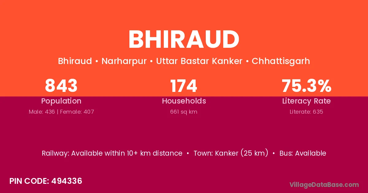 Kanker (25 km) is the nearest town to Bhiraud village for major economic activities and is located approximately 25 km away.