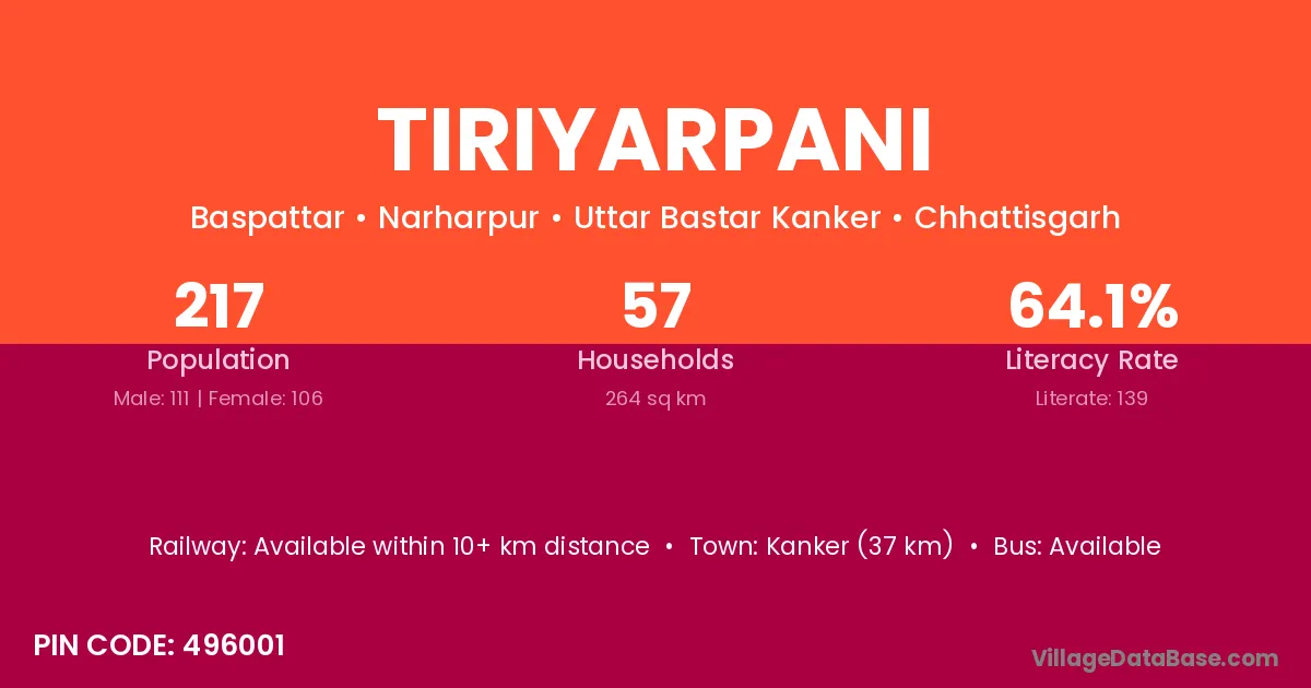 Kanker (37 km) is the nearest town to Tiriyarpani village for major economic activities and is located approximately 37 km away.