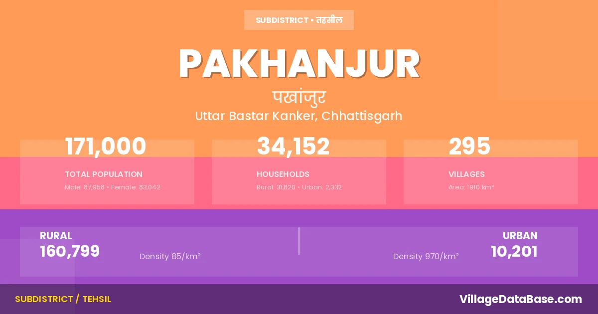 Pakhanjur is a town and Tehsil in the Uttar Bastar Kanker district of the Chhattisgarh. In India, a Tehsil is a subdivision of a district responsible for the administration and revenue collection of a specific area within the district. Tehsils play a crucial role in the local governance structure, contributing significantly to the development and administration of their communities.