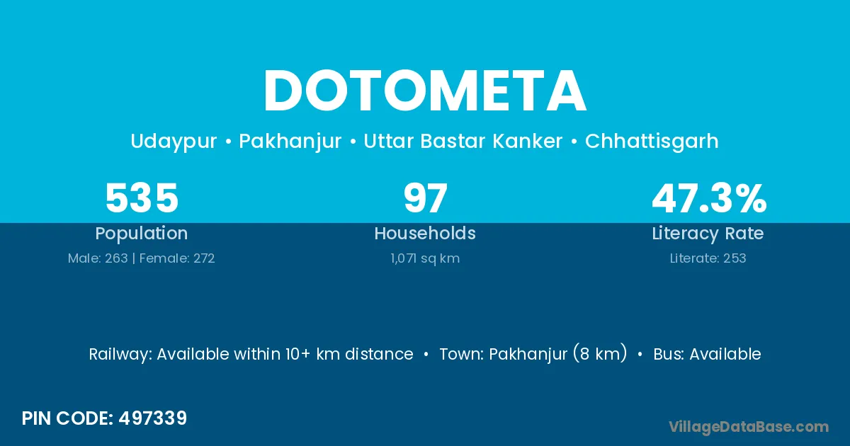 Pakhanjur (8 km) is the nearest town to Dotometa village for major economic activities and is located approximately 8 km away.