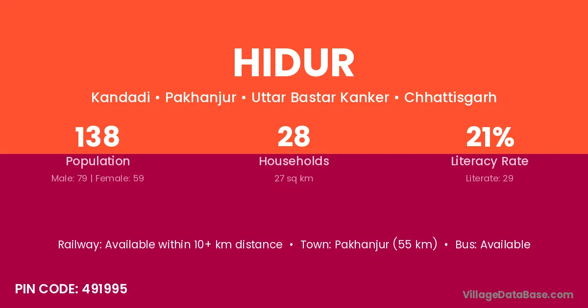 Pakhanjur (55 km) is the nearest town to Hidur village for major economic activities and is located approximately 55 km away.