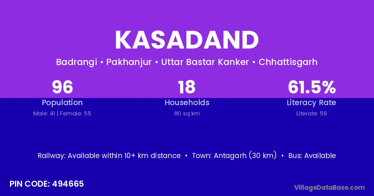 Kasadand village has a total population of 96 people, of which 41 are males and 55 are females.