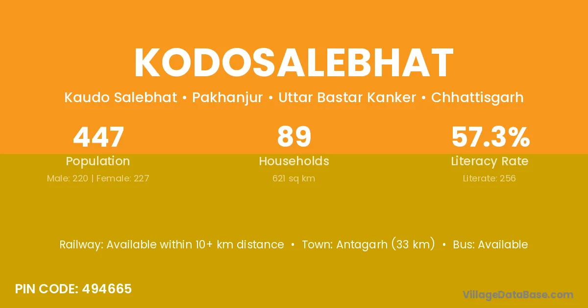 Kodosalebhat village has a total population of 447 people, of which 220 are males and 227 are females.