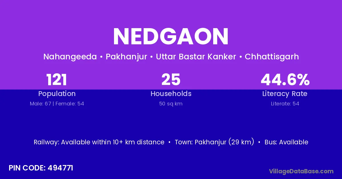 Nedgaon village has a total population of 121 people, of which 67 are males and 54 are females.